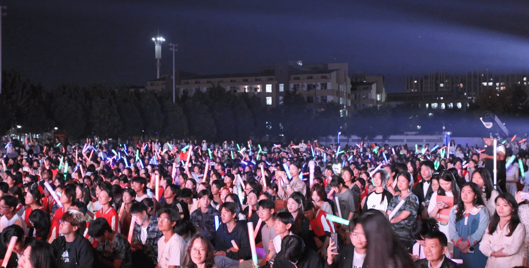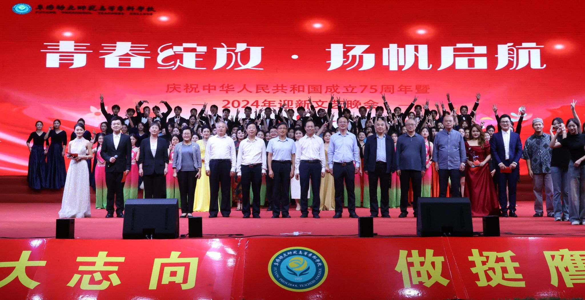 青春正飞扬,燃梦绘金秋。9月25日晚,我校“青春绽放 扬帆起航”——庆祝中华人民共和国成立75周年暨2024年迎新文艺晚会在学校田径场精彩上演。校领导董志诚、汤志、于华献、陈绪龙、徐常恺出席晚会,各部门、各学院党政负责人、老师代表、全体新生辅导员、2024级全体新生和部分老生欢聚一堂,共飨视听盛宴。晚会还邀请了市政府、市委宣传部、市委统战部、市委网信办、市教育局、市文旅体局、市重点工程管理处、团市委、市妇联相关单位领导参加。