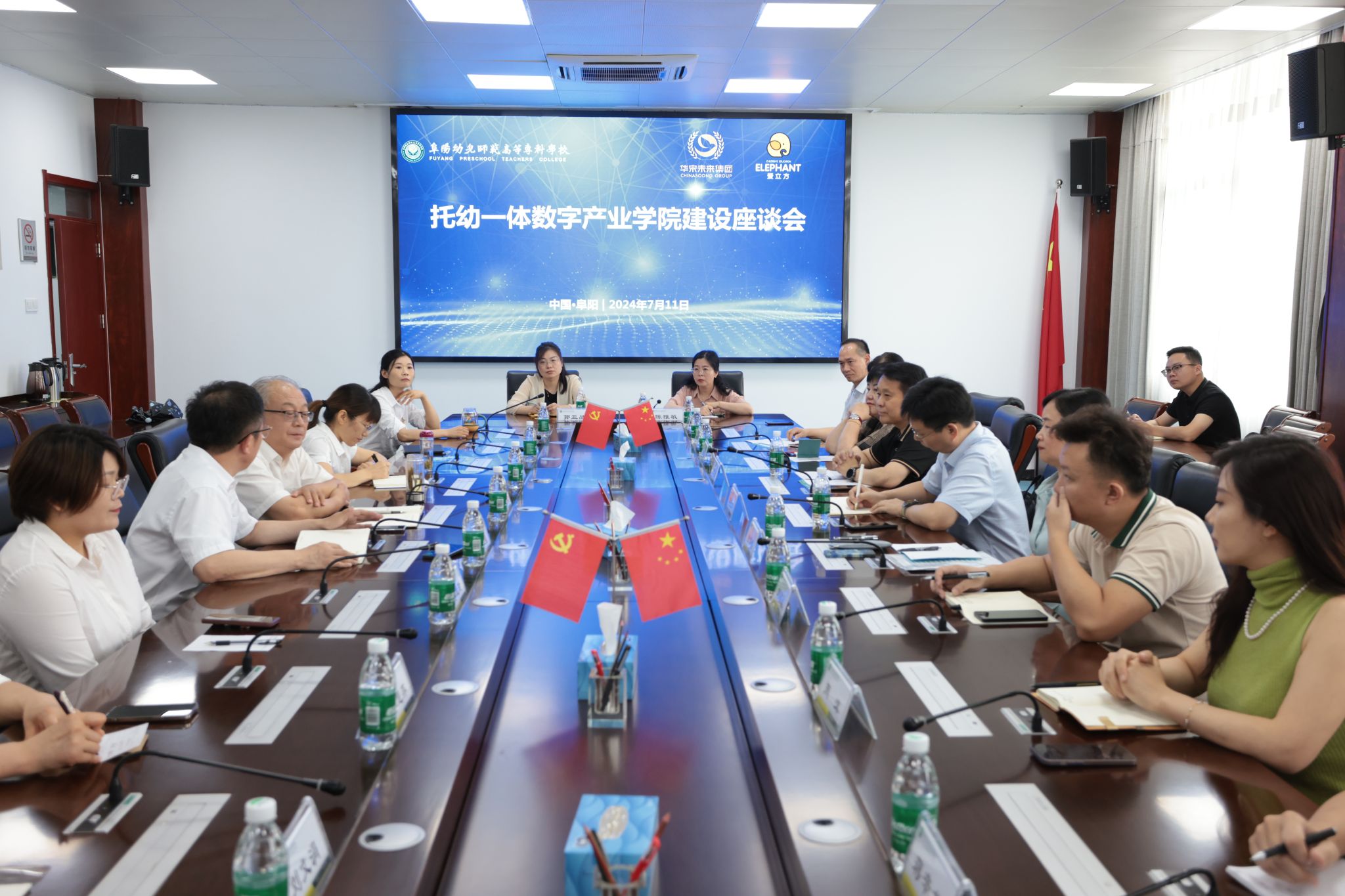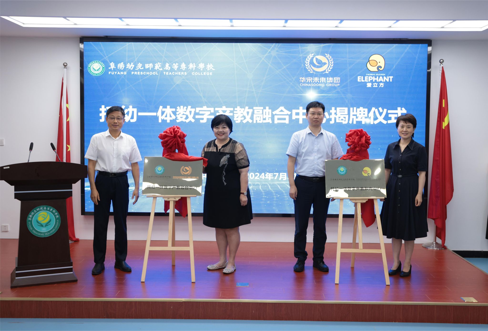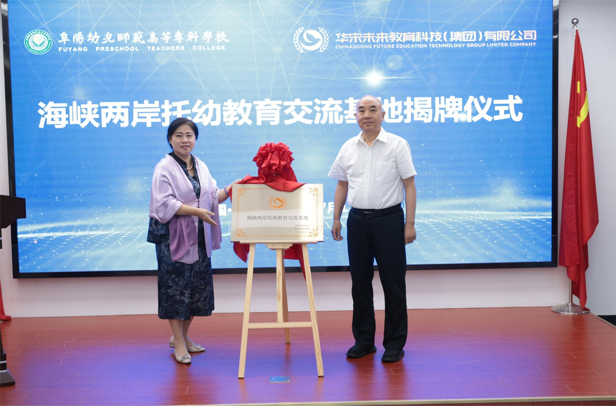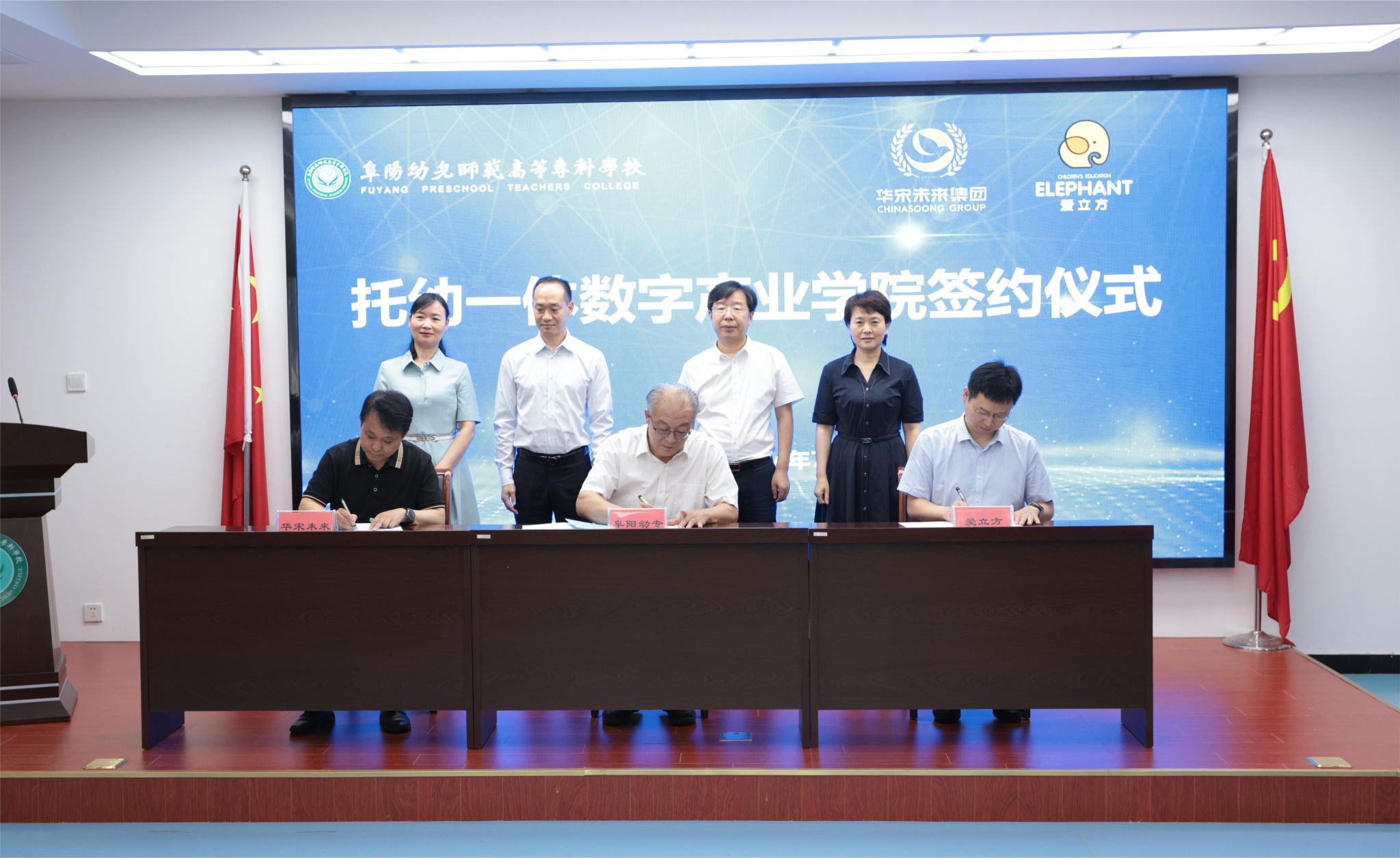 在与会人员共同见证下,三方签署合作协议,并顺利揭牌海峡两岸托幼教育交流基地、托幼一体数字产教融合中心、阜阳幼专托幼一体数字产业学院。