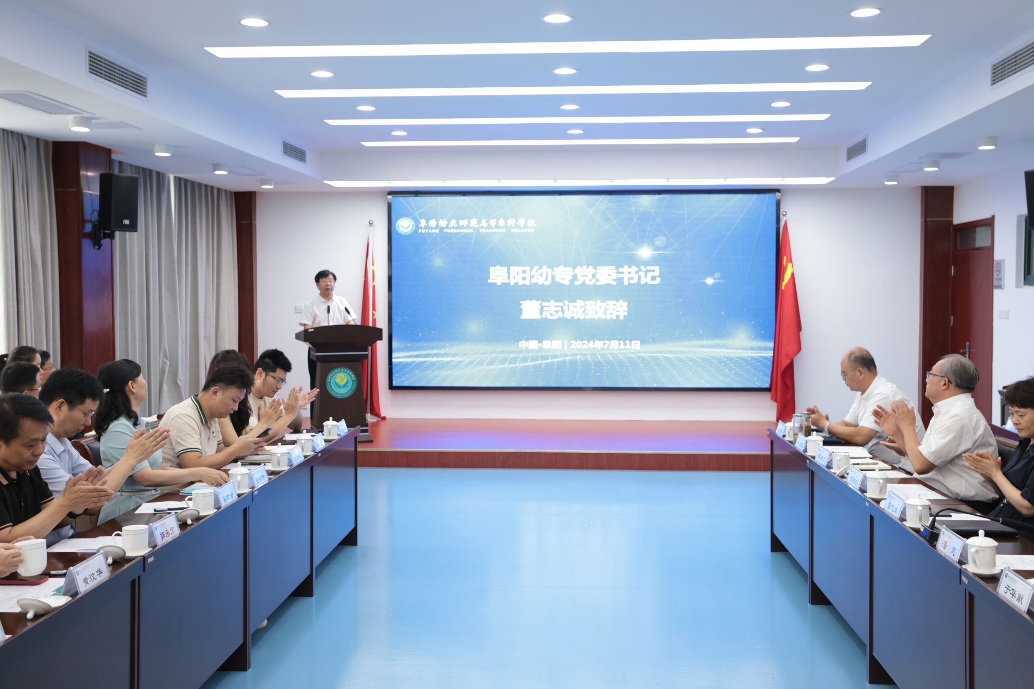 董志诚在致辞时指出,此次阜阳幼专与华宋未来教育科技集团、武汉爱立方儿童教育传媒股份有限公司共同成立阜阳幼专托幼一体数字产业学院,既是贯彻党的二十大精神的实际行动,也是构建托幼一体化服务体系的有效支撑,更是推进校企融合共建学前教育高水平专业群的有益探索,有利于充分调动各自优势资源,全面优化调整我校专业布局,深化产教融合、科教融汇,建强幼教托育、智慧养老相关专业,实现教育链、人才链与产业链、创新链有机衔接,为我市打造“三地一区”、建设“十个区域性强市”奋斗目标贡献阜阳幼专力量。