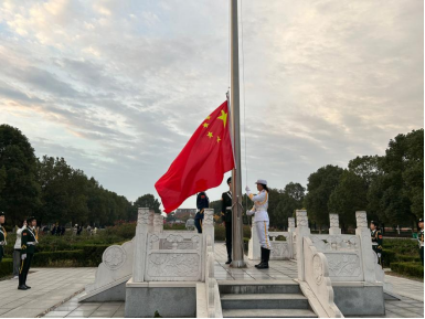 7点10分,国旗护卫队的同学们迈着整齐划一、铿锵有力的步伐,护送着五星红旗走向旗杆,随着激昂的《义勇军进行曲》响起,师生们注视着五星红旗冉冉升起,在熠熠晨光中迎风飘扬。